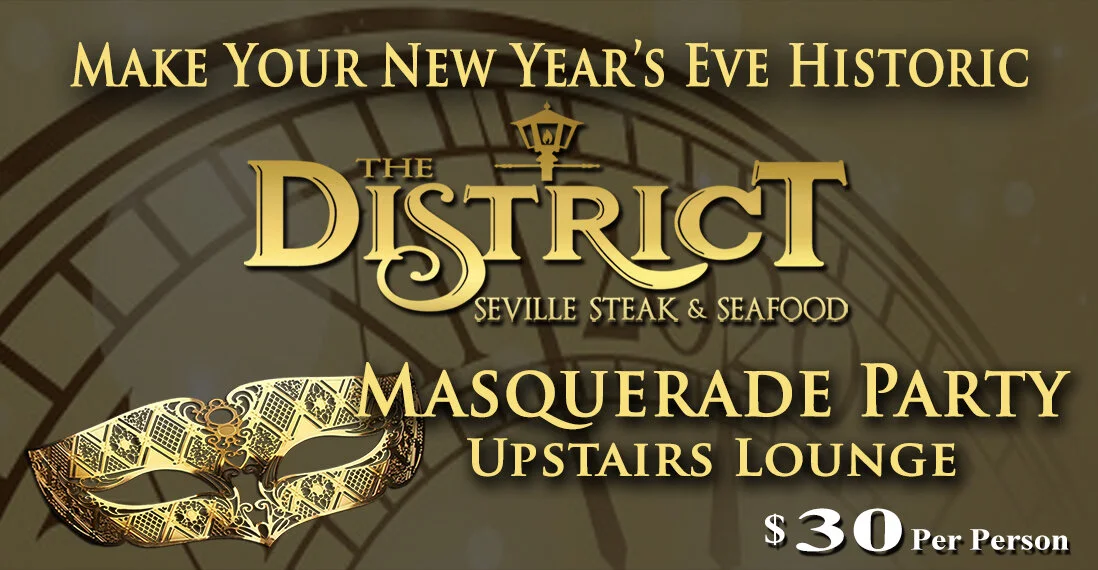 Make your New Year's Eve Historic! The District is hosting a Masquerade Party in our Upstairs Lounge from 8:00pm - 1:00am on New Year's Eve. $30 per person. Ticket includes a special New Year's Eve Party Package and champagne toast at midnight. Purchase tickets online here, at the District's hostest stand or by calling the District at 850-332-5224.