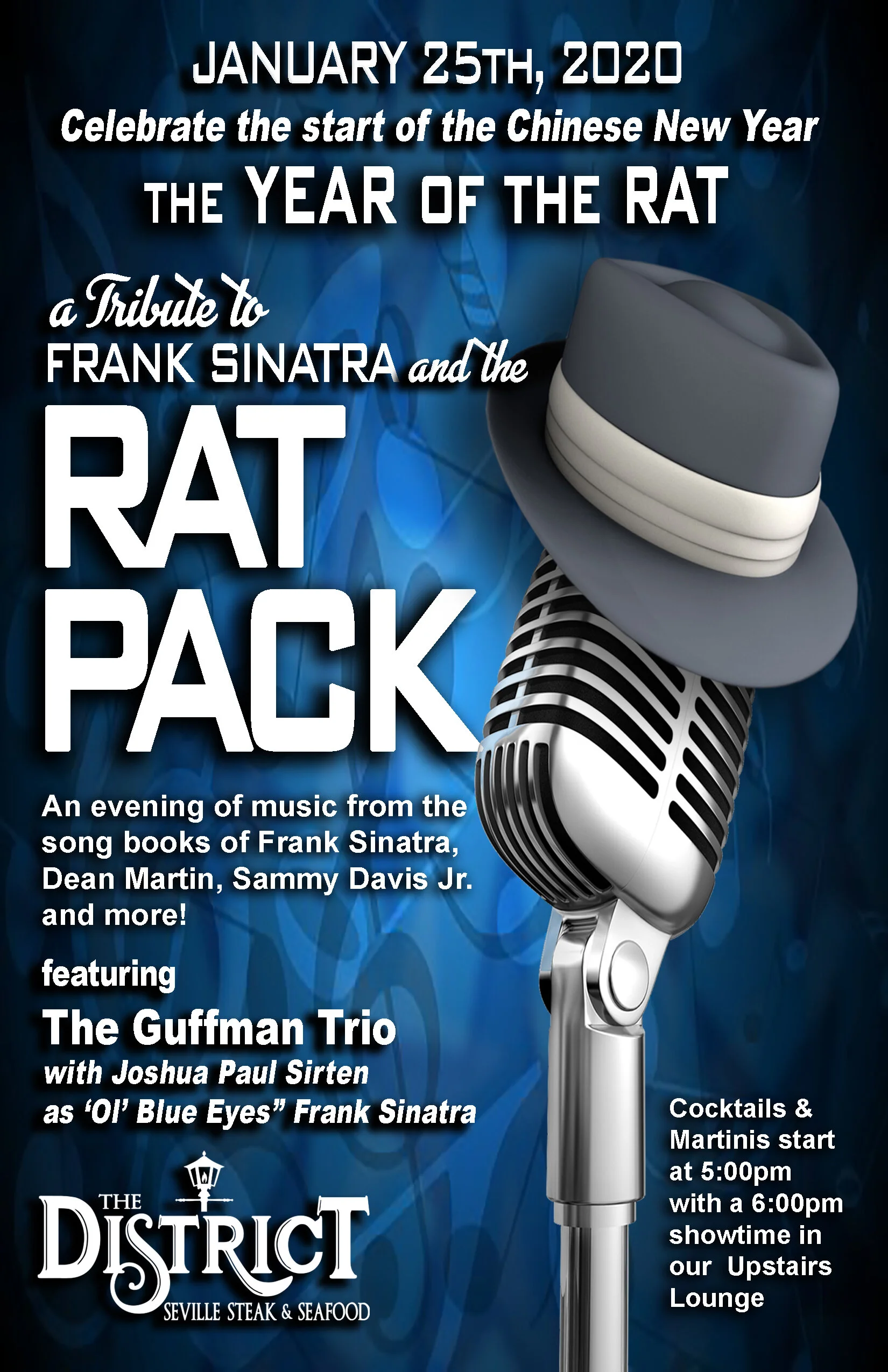 Come celebrate the 2020 Chinese New Year with a glorious Rat Pack themed evening on Saturday, January 25, 2020. Featuring the Guffman Trio with Joshua Paul Sirten as “Ol’ Blue Eyes,” Frank Sinatra. We will transport the District Lounge to a timeless era of the Rat Pack’s nostalgia and class, made famous by the likes of Dean Martin, Sammy Davis, Judy Garland and many other legendary entertainers.